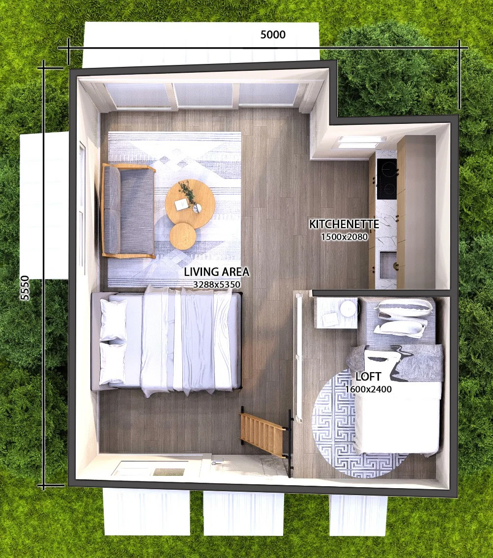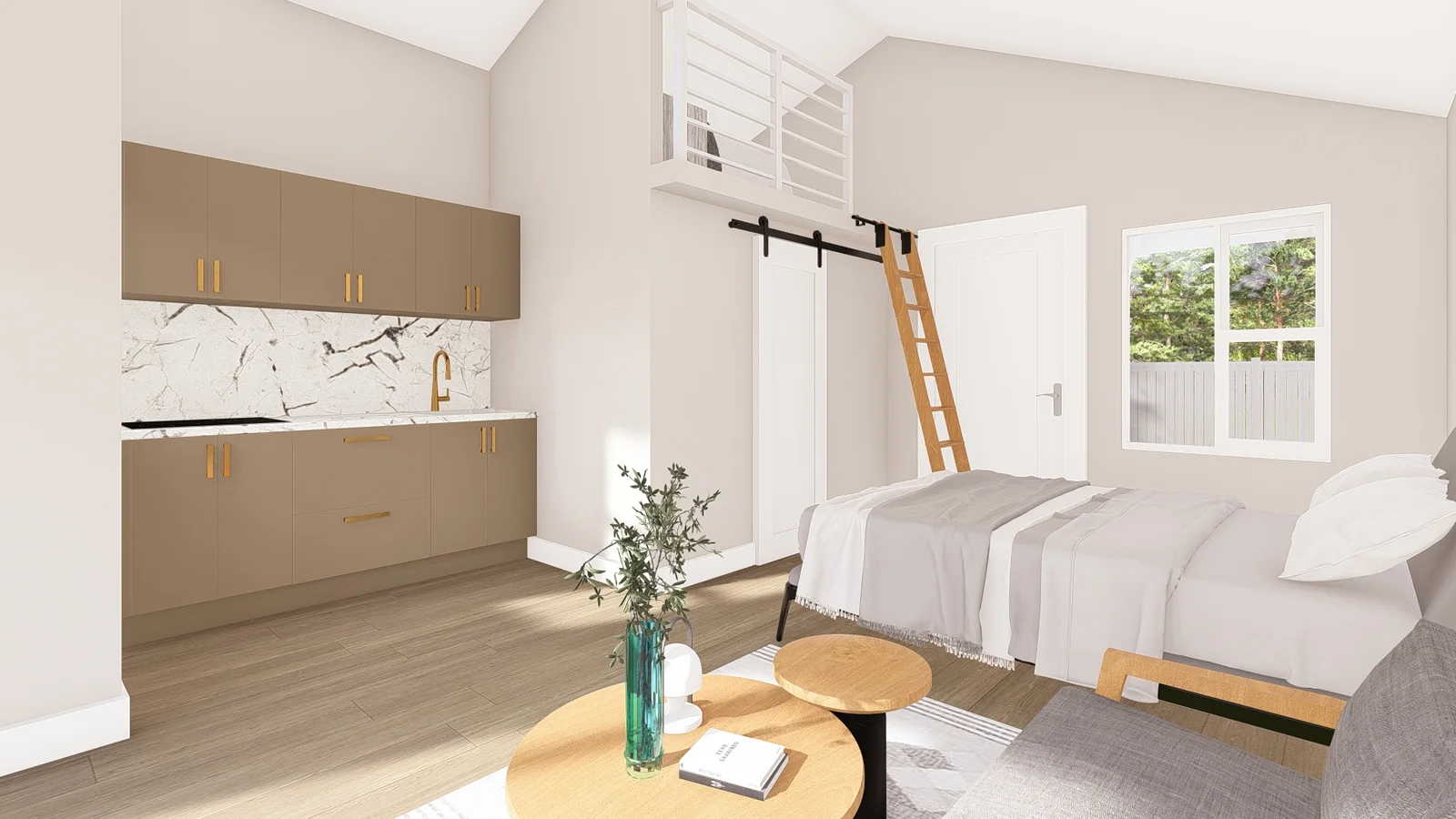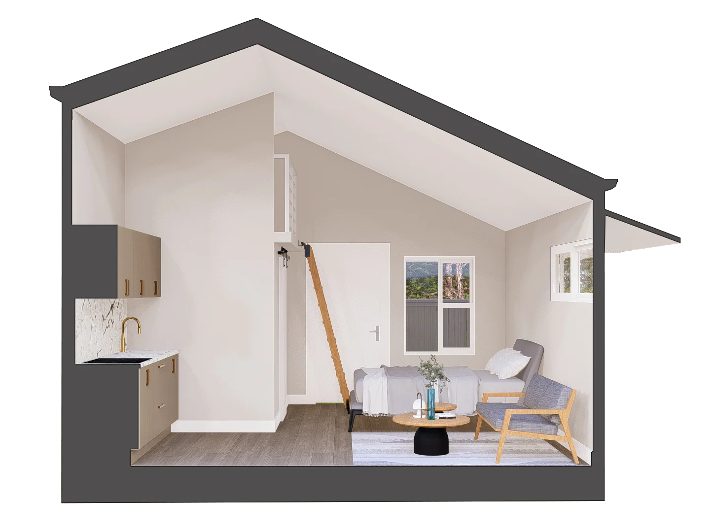 The Blue Wren Studio with a Loft brings compact living with bonus 5 square meters of storage or even an additional cosy sleeping space blending comfort, convenience, and style in one clever design. The loft comfortably fits a double bed, while the spacious living area provides room to relax and entertain. If you need extra family space or want to offer short-term stays. Our homes are built to 8 Star Energy specifications and customisable to fit your requirements. Optimised to join onto an existing home as an addition or extension, this plan can be customised to suit your needs and look like it was part of the original design for your home.